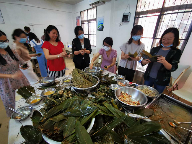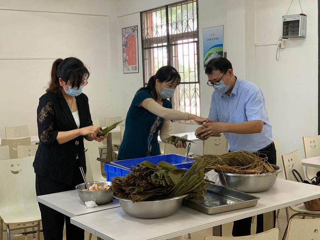 活動(dòng)現(xiàn)場(chǎng)準(zhǔn)備了糯米、粽葉、板栗、蛋黃等材料,大家圍在一起,從嘗試、普及到大展身手,歡聲笑語(yǔ)、棕葉飄香,參與人員包得不亦樂(lè)乎。
