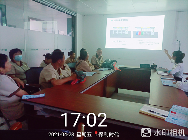 4月23日、24日下午聯港公司垃圾分類項目宣講員到保利時代、中海左岸嵐庭小區(qū)開展垃圾分類專題培訓,保利時代、中海左岸嵐庭物業(yè)管理層和保潔隊伍等共計50人,分成兩批參訓。聯港公司垃圾分類項目宣講員受邀前往現場作《垃圾分一分金灣美十分》主題培訓。