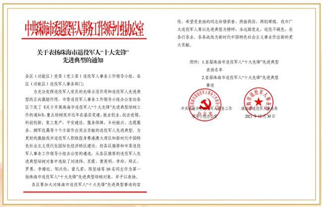 2022年4月26日,接珠海市委退役軍人事務工作領導小組辦公室通知,珠海聯(lián)港城市建設管理有限公司總經(jīng)理李增旺獲評“珠海市退役軍人十大先鋒—復工復產(chǎn)先鋒”。